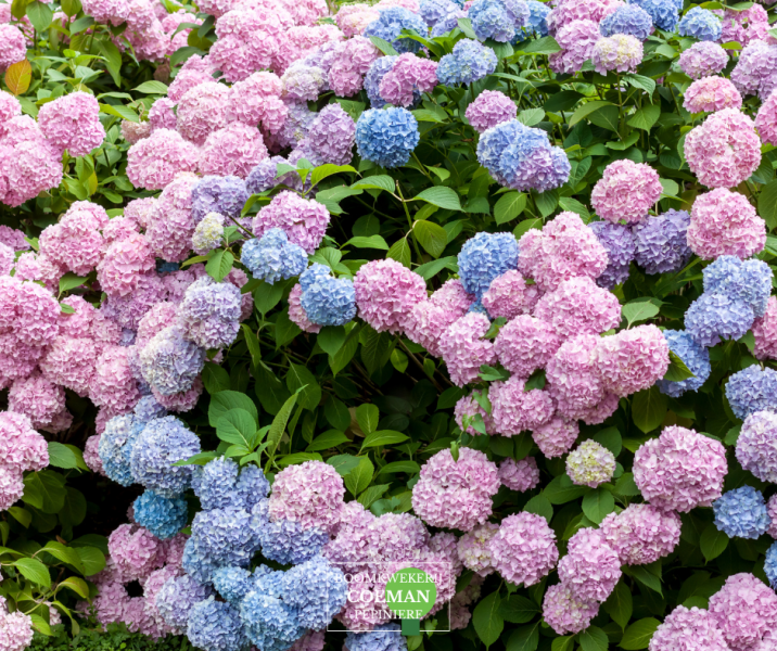 De hydrangea macrophylla, ook wel de boerenhortensia of bolhortensia genoemd, beschikbaar in roze, blauw, paars en wit (afhankelijk van de zuurtegraad van de grond)